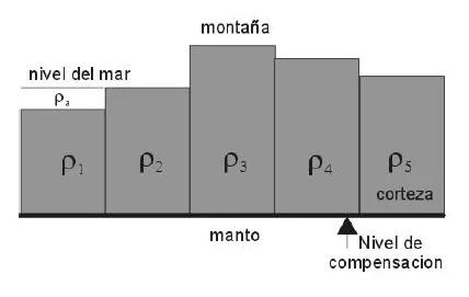 Para ellos es necesario asumir una profundidad media de la corteza justamente por debajo del nivel del mar. En la Figura 4, se observa una representación esquemática del Modelo de Airy-Heiskanen.