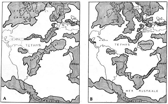 Fig. 1. Puentes Intercontinentales: A. Finales de la Era Primaria; B. Finales de la Era Secundaria.